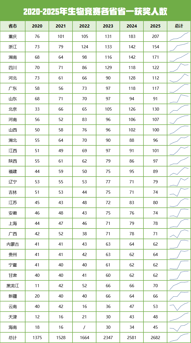 不论是数学、物理、化学、生物还是信息学科,竞赛省一的获奖人数都有不小人数的上涨。其中生物竞赛省一总人数几乎是翻了一倍!而认可度较高的数学、物理相对来说涨幅就更小一些。