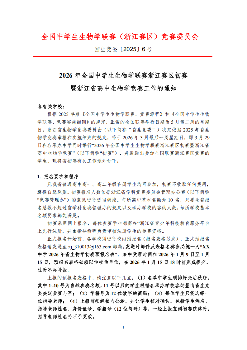 根据2025年版《全国中学生生物学联赛、竞赛章程》和《全国中学生生物学联赛、竞赛实施细则》的规定,正常的全国联赛举行日期为5月第二周的星期日。浙江省生物学竞赛委员会(以下简称“省生竞委”)决定依据2025年省生物学竞赛章程和实施细则的规定,将于2026年3月最后一周星期日,即3月29日在各承办中学同时举行“2026年全国中学生生物学联赛浙江赛区初赛暨浙江省高中生物学竞赛”(以下简称“初赛”),并遴选出参加全国联赛浙江赛区竞赛的学生。