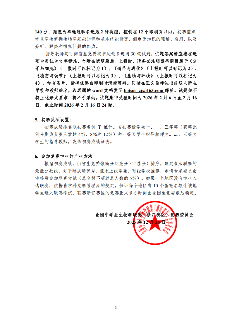 2026年全国中学生生物学联赛浙江赛区初赛通知
