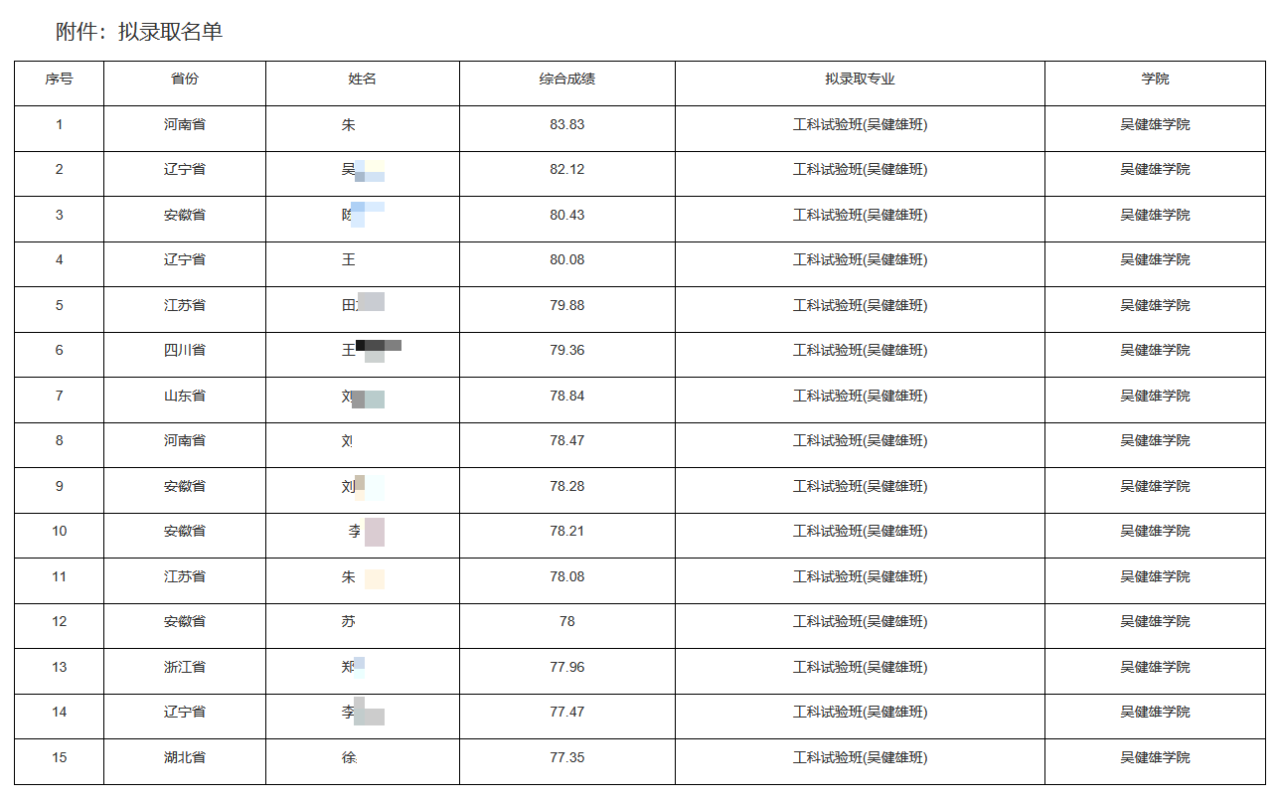 招生总计划不超过15人,招生专业为工科试验班(吴健雄班),由吴健雄学院进行管理和培养。