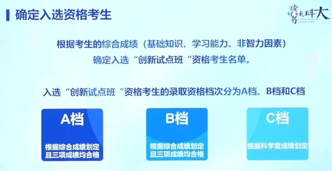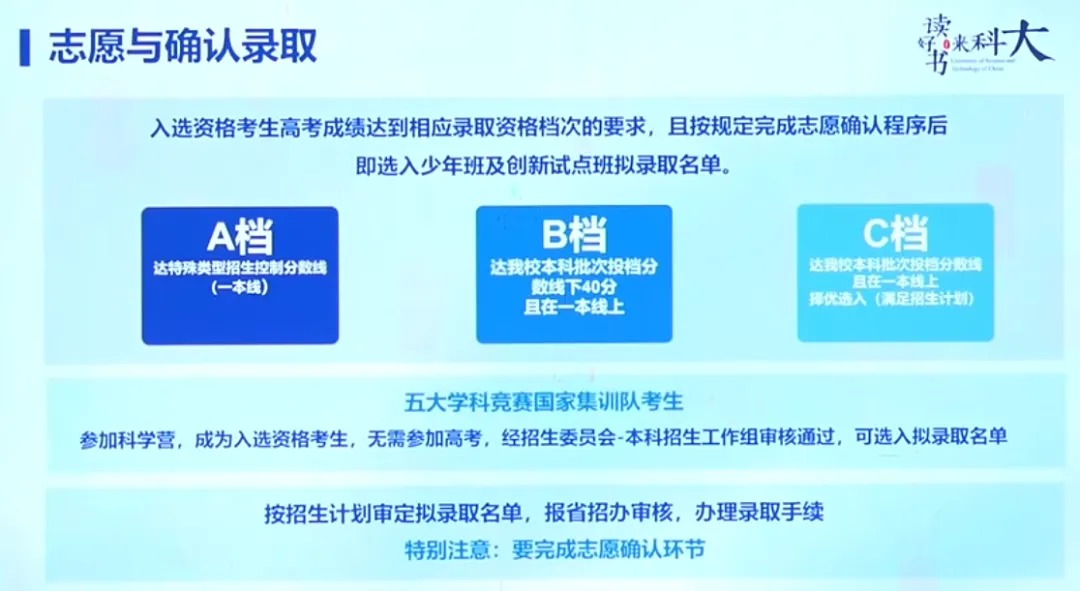 C档:高考成绩需达到中科大本科批次投档分数线,且不低于一本线,学校在招生计划范围内择优录取;