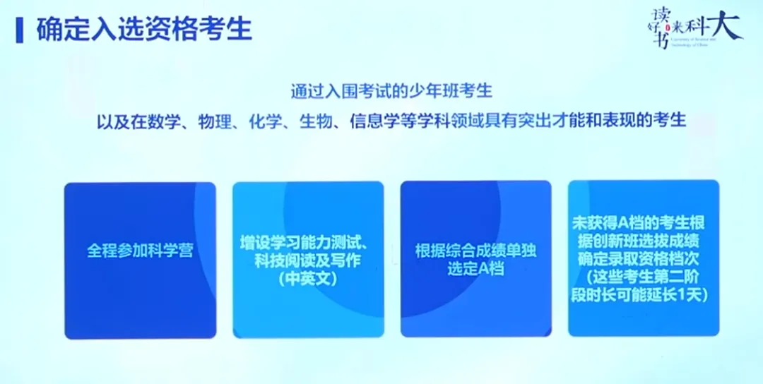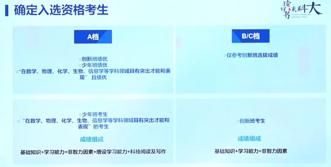 (2)少年班及五大竞赛金银牌考生:在常规考核基础上增设两项测试,其中学习能力测试满分100分、科技阅读及写作测试满分50分,综合满分655分,该类考生入选资格单独划定为A档。