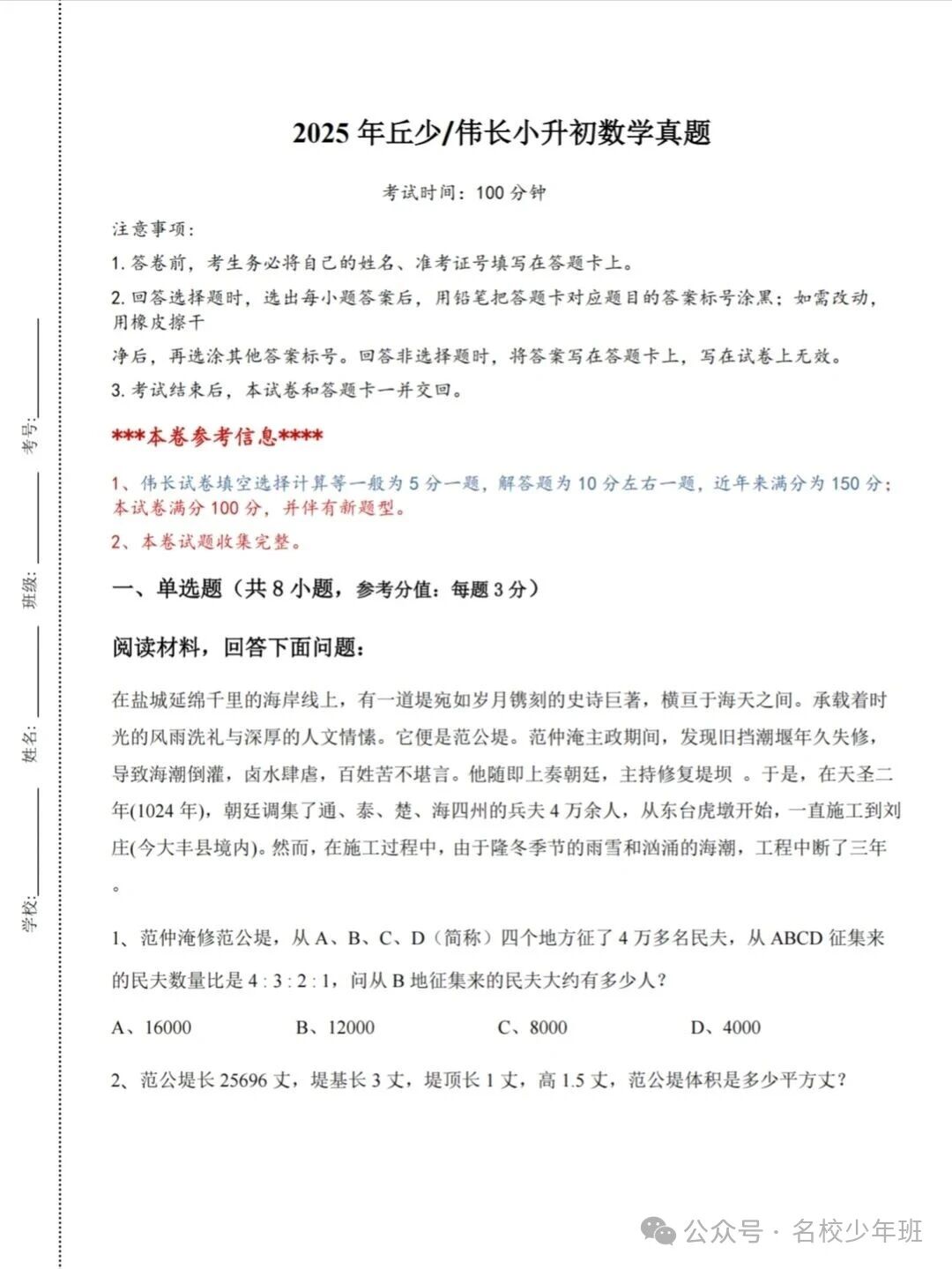 苏州中学特色班级伟长班、丘成桐班备受关注。近日,自主选拔在线团队收集整理了2025年苏州中学丘班/伟长班小升初数学真题,供参考学习。