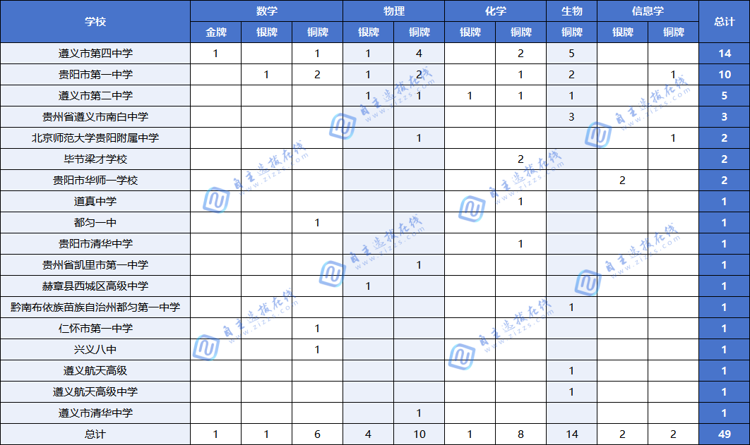 遵义市第四中学 (14枚):绝对的领头羊。奖牌总数断层第一,且是唯一获得金牌的学校,在数学、物理、生物四个个学科均有斩获,呈现出全面强势的特点、目前信息学竞赛是四中的短板,还需在新的一节赛事中