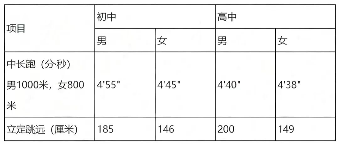 ④体能测试:立定跳远和中长跑,此项为合格性测试,不计入复试成绩,合格标准如下: