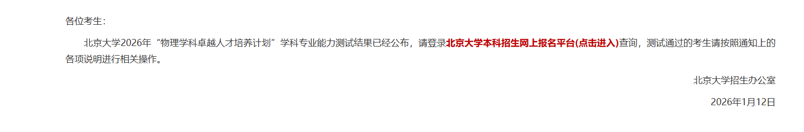 北京大学2026年“物理学科卓越人才培养计划”学科专业能力测试结果已经公布,请登录北京大学本科招生网上报名平台:https://www.ccuut.edu.cn/admission_pku/login.php,测试通过的考生请按照通知上的各项说明进行相关操作。