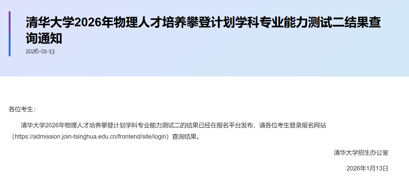 清华大学2026年物理人才培养攀登计划二试成绩出炉