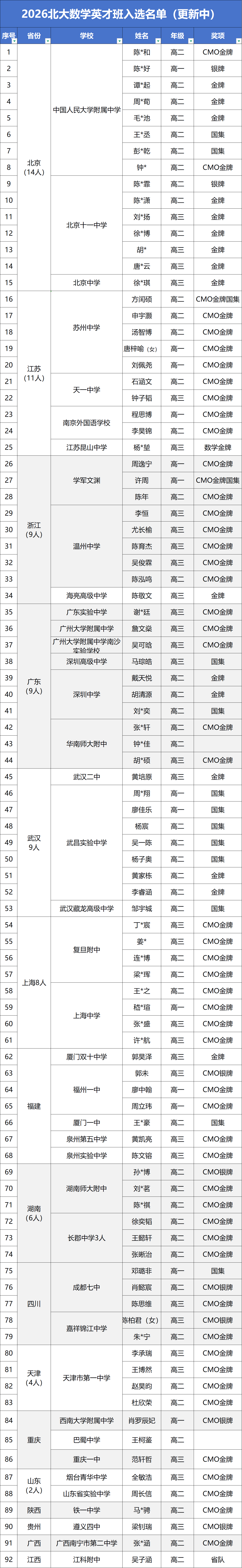 2026年北京大学数学英才班入选名单汇总(更新中)