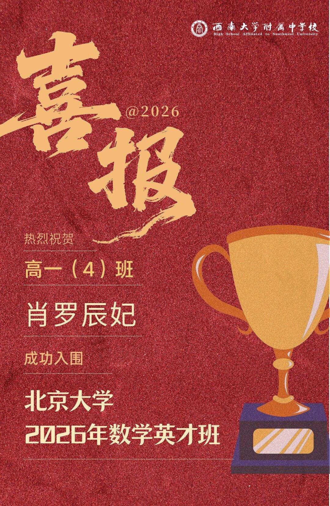 本学期,西南大学附属中学数学竞赛团队已实现“清北四连击”,充分展现了附中在数学拔尖人才培养领域的雄厚实力与丰硕成果。此前,附中学子已五大学科竞赛等赛事中屡获佳绩!捷报再续,荣耀叠加!本次摘得北大数学英才班席位,更是为学校拔尖创新人才培养成果再添亮丽一笔,也为2026年奏响了振奋人心的奋进序曲!