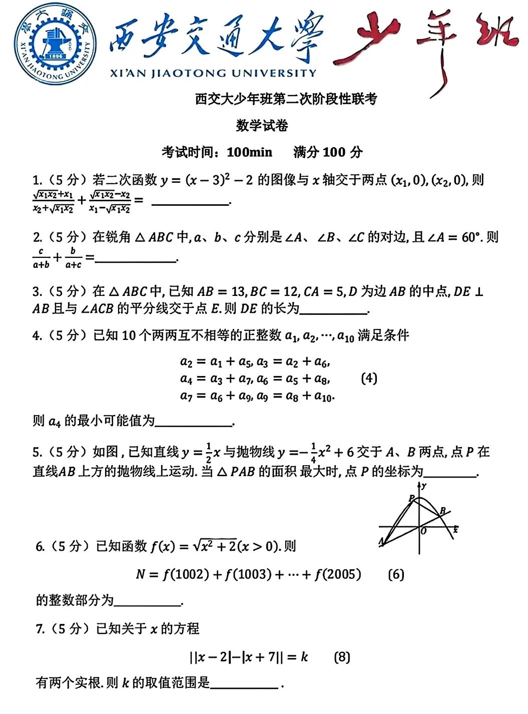 近日,自主选拔在线团队整理2026届西安交通大学少年班第二次阶段性联考数学试卷,欢迎考试下载参考!