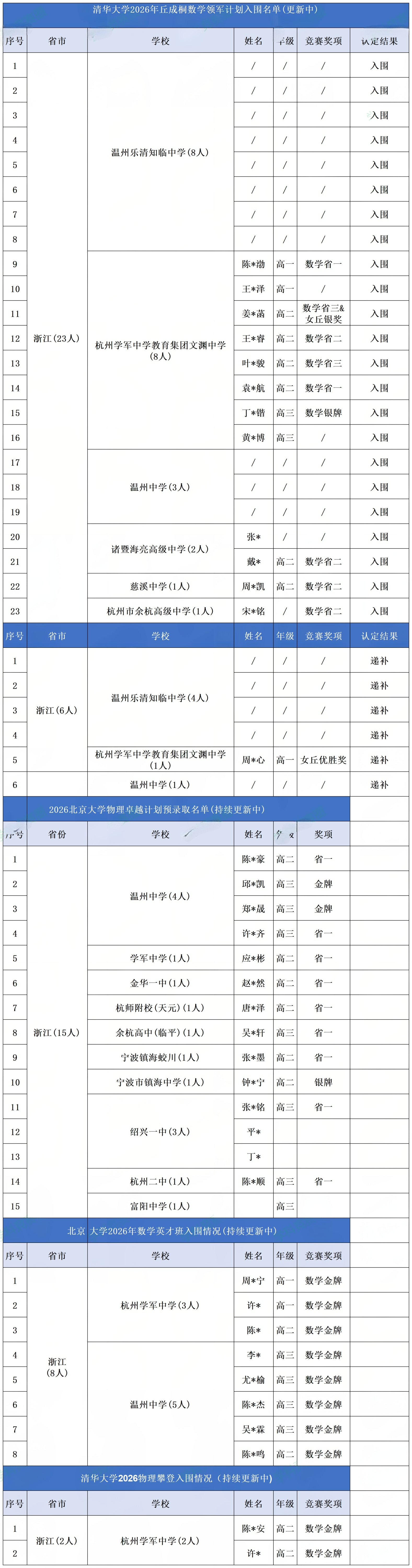 2026年清华北大数学英才班、清华物理攀登计划、北大物理卓越计划、清华丘成桐数学领军计划5大少年班入围名单陆续公布,各中学喜报频传,清北五个少年班目前统计到浙江入围总人数48人,自主选拔在线团队整理相关内容,以便考生参考!