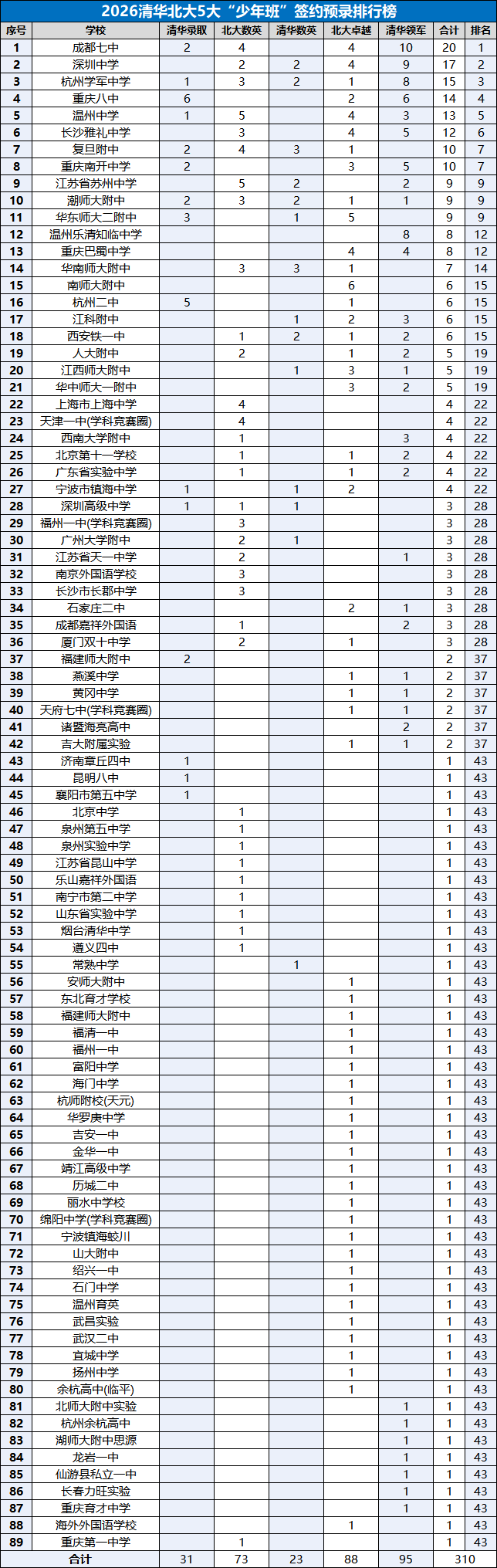 其中,北京大学物理卓越计划与清华大学新领军计划采用保送式预录取签约方式;而清北数学英才班及清华物理攀登计划则为签约一本线的预录取模式。总体而言,这五大项目构成了清北面向顶尖竞赛生的核心预录取通道,不仅直接决定学生的升学去向,也在一定程度上反映了一所高中在拔尖创新人才培养方面的综合实力。因此,依据2026年清华北大预录取的相关公开数据进行统计,形成榜单,供广大师生及竞赛领域从业者参考。