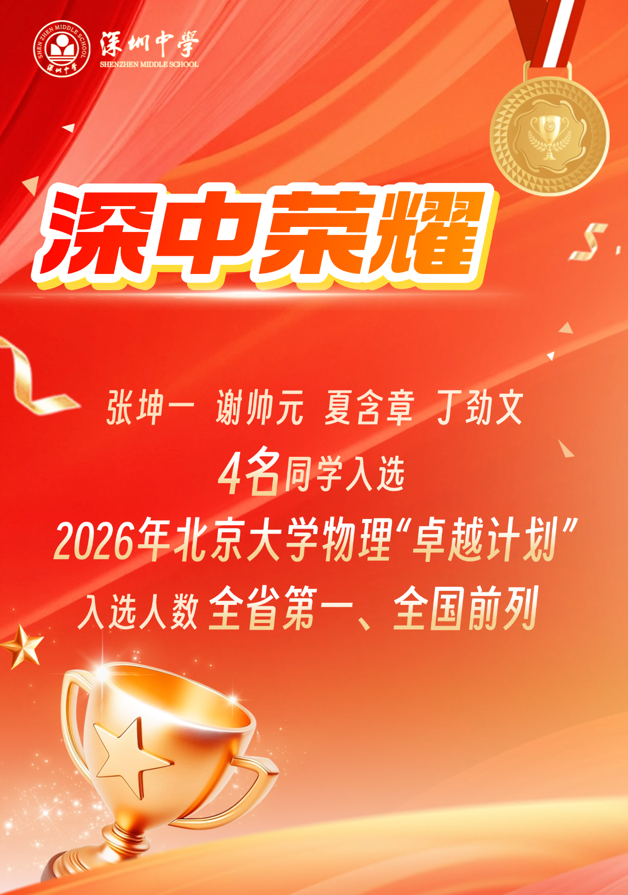 日前,2026年北京大学物理“卓越计划”入选名单公布。深圳中学张坤一(高三)、谢帅元(高三)、夏含章(高二)、丁劲文(高二)4位同学入选,入选人数全省第一,全国前列。这是深圳中学在物理拔尖创新人才培养上取得的又一辉煌成绩。