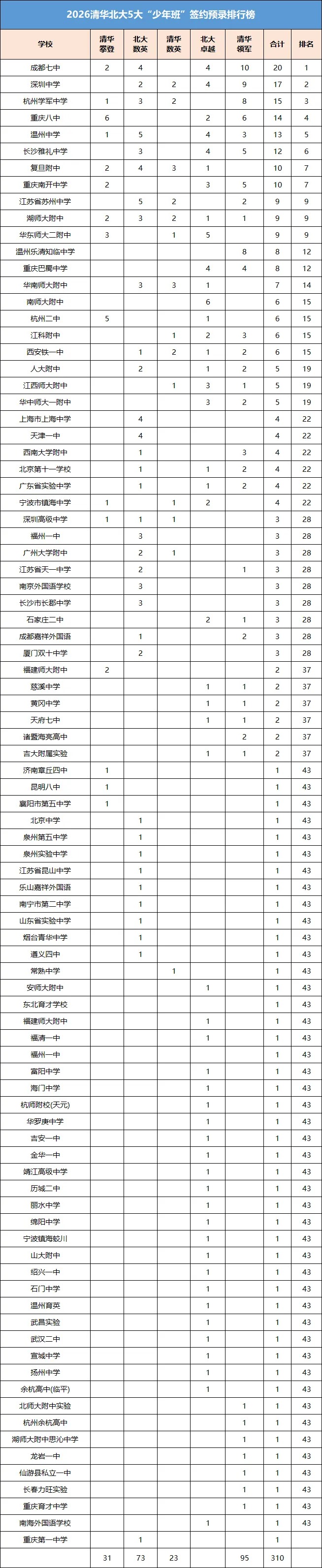 2026年年,清华北大五大少年班入选人数及名单陆续公布中,自主选拔在线团队整理了2026年清华北大五大少年班中学分布盘点相关内容,一起来看看吧!