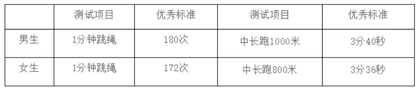 体质测试项目包括1分钟跳绳、中长跑(男生1000米、女生800米),优秀标准为: