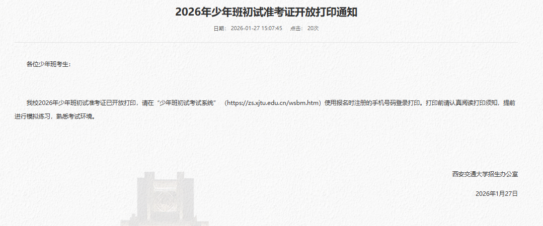 2026年西安交通大学少年班初试准考证开放打印通知刚刚发布,自主选拔在在线团队整理2026年西安交通大学少年班初试准考证开放打印通知相关内容一起来看!