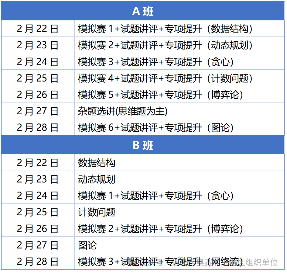 B班:“NOIP+”到“省选-”难度。课堂授课,知识点及例题讲解为主,安排有三场模拟测试。
