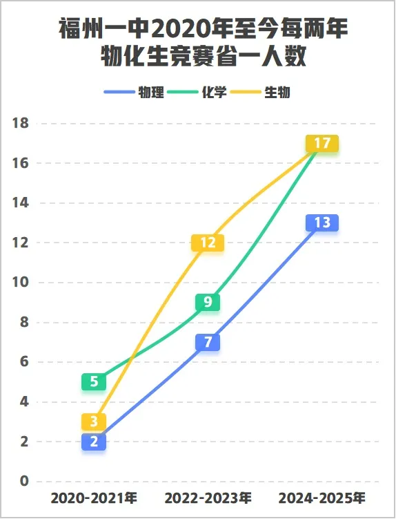 省一等奖人数(13人)全省第一,而且近五年来获奖人数一直在快速增加,势头很稳。