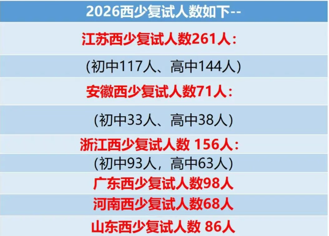 西少复试入围人数,江苏省261人 ,全国第一!占20%以上,其初中组和高中组人数均过百人;