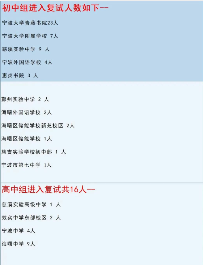 在复试入围的宁波学生来自全市15所学校,其中宁波大学青藤书院和宁波大学附属学校表现尤为突出,占据全省初中组总入围人数的三分之一以上。