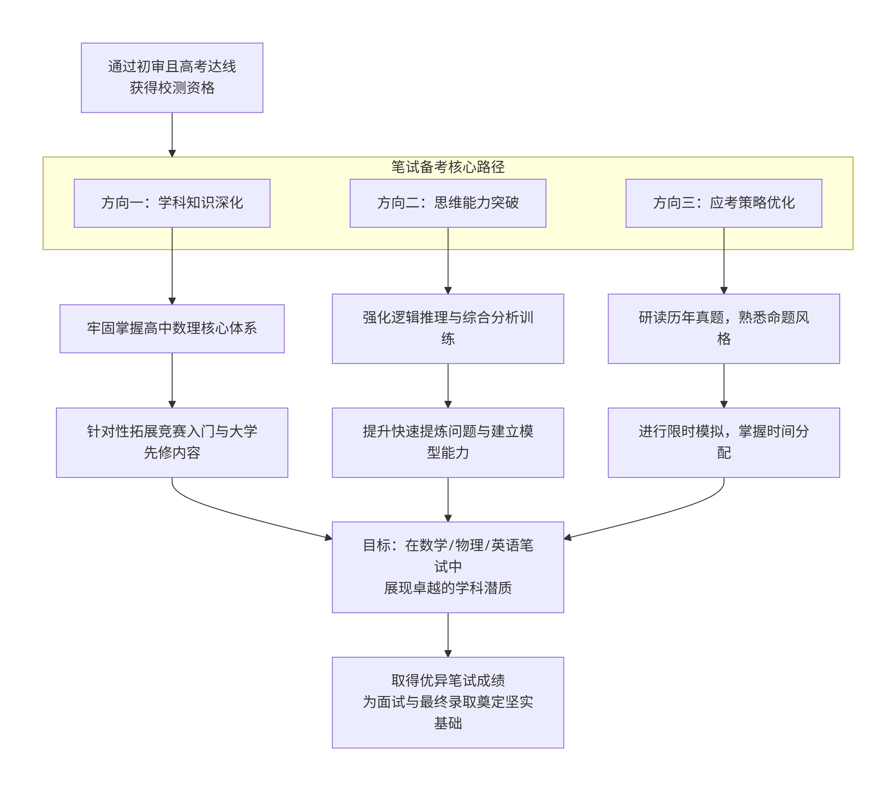 笔试在整个选拔流程中的位置与核心备考路径如下图所示,它承接着高考,开启了通往最终面试的关键一环:
