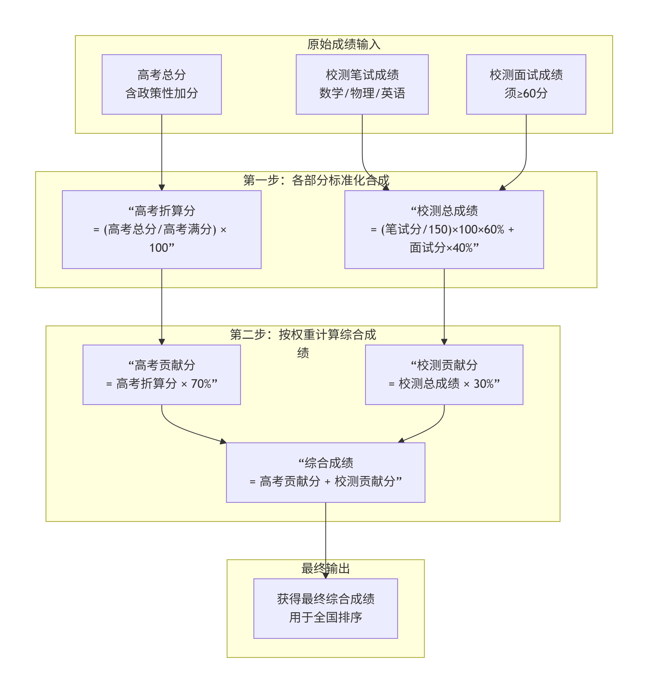 综合成绩的合成是一个两步走的过程:首先,需要将原始的高考总分和校测各部分成绩标准化为百分制;其次,按照既定的权重进行加权求和。