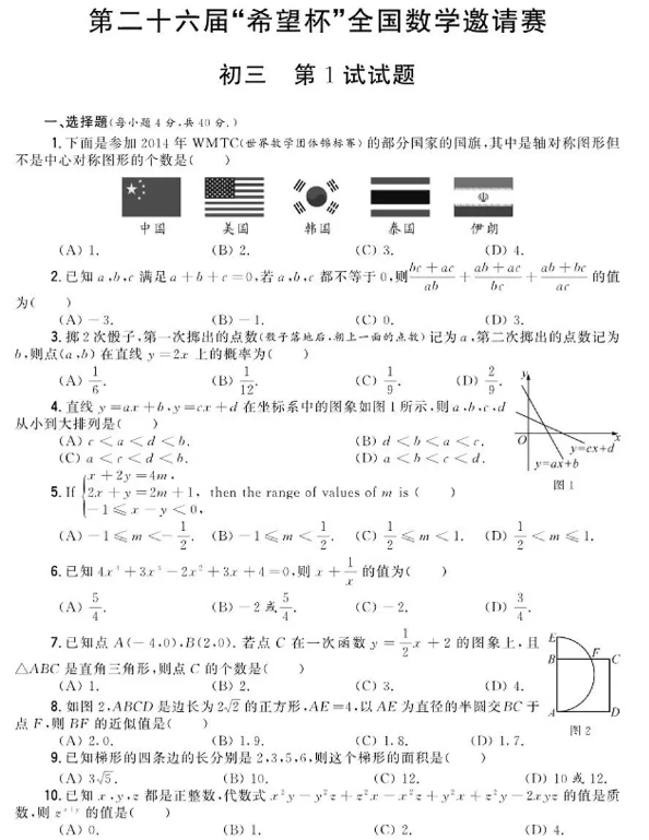第26届“希望杯”全国数学邀请赛九年级第1试试题