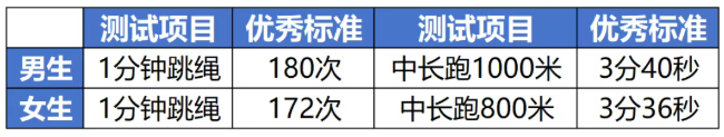 体质测试项目包括1分钟跳绳、中长跑(男生1000米、女生800米),优秀标准为:
