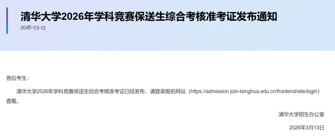 3月13日起,清华大学2026年学科竞赛保送生综合考核准考证开放打印,考生可登录报名网站(https://admission.join-tsinghua.edu.cn/frontend/site/login)进行查询。