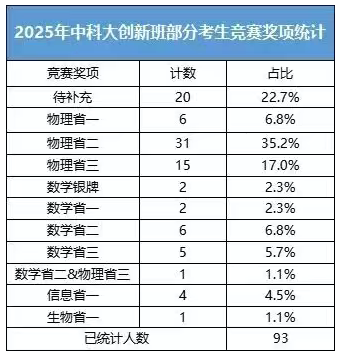 2025 中科大少年班录取数据很有说服力:物理竞赛获奖 23 人:省二 15 人、省三 4 人,仅 1 人银牌;数学竞赛获奖 10 人:省二 4 人,2 人铜牌;信息学竞赛 2 人,另有 9 人奖项待核实,几乎全员有数理竞赛背景。