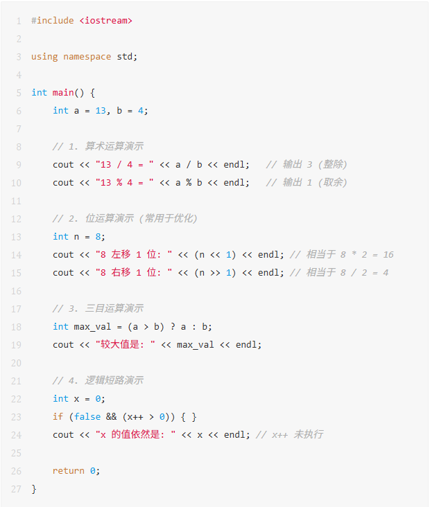 基本运算虽小,却是程序效率与正确性的源头。位运算能帮你优化常数时间,而对逻辑运算的精准把握能让你在处理复杂分支时游刃有余。 只有夯实这些原子级的知识点,才能在面对难题时稳操胜券。