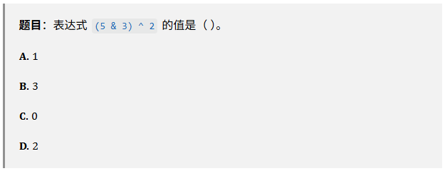 再计算异或运算:1 ^ 2。1 的二进制是 001,2 的二进制是 010。001 ^ 010 = 011(即十进制 3)。答案:B