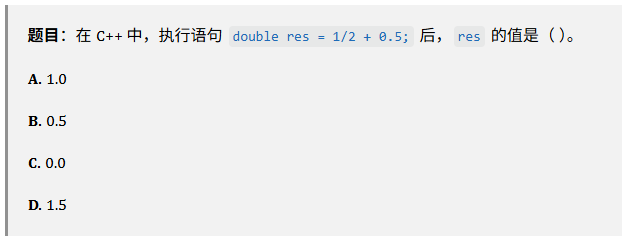 【解答】在 C++ 中,1/2 是两个整数相除,结果执行整除运算,得到 0。随后 0 + 0.5 得到 0.5。最后赋值给 double 类型的 res。答案:B