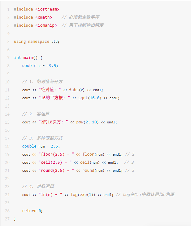 在信息学竞赛中,数学函数的使用往往伴随着精度控制和类型转换: