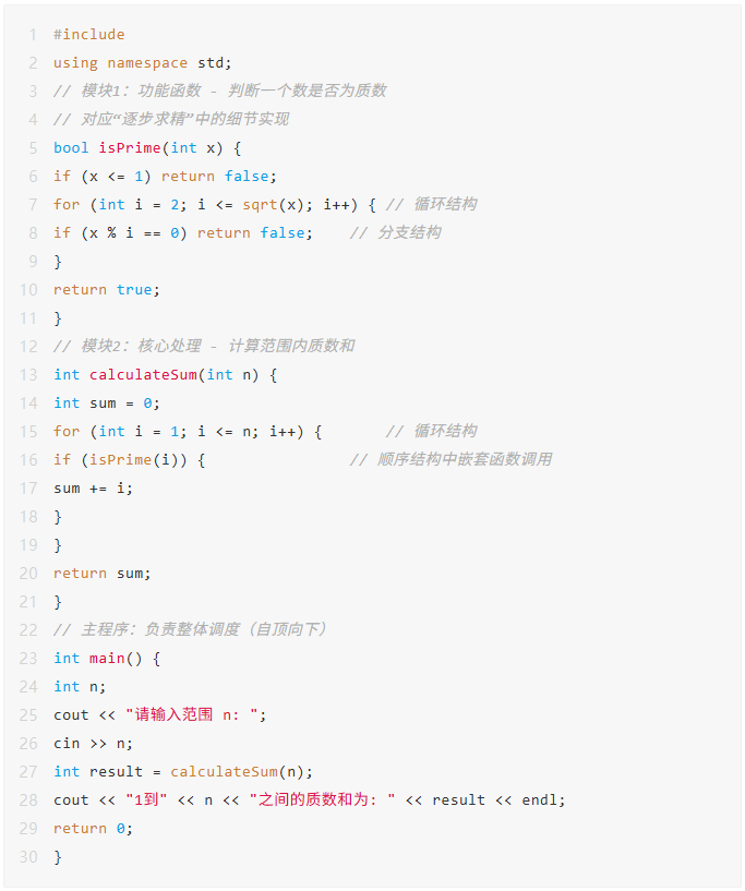下面的代码演示了如何使用“自顶向下、逐步求精”的思想解决一个简单问题(判断质数并求和),而非将所有逻辑堆砌在main函数中。