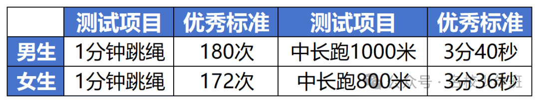 体质测试项目包括1分钟跳绳、中长跑(男生1000米、女生800米),优秀标准为:
