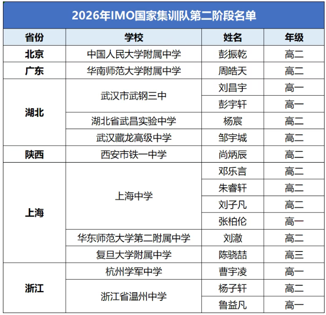 2026年IMO国家集训队第二阶段参赛名单