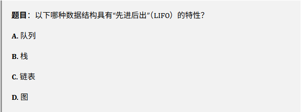 【解答】栈(Stack)是先进后出(LIFO);队列(Queue)是先进先出(FIFO)。答案:B