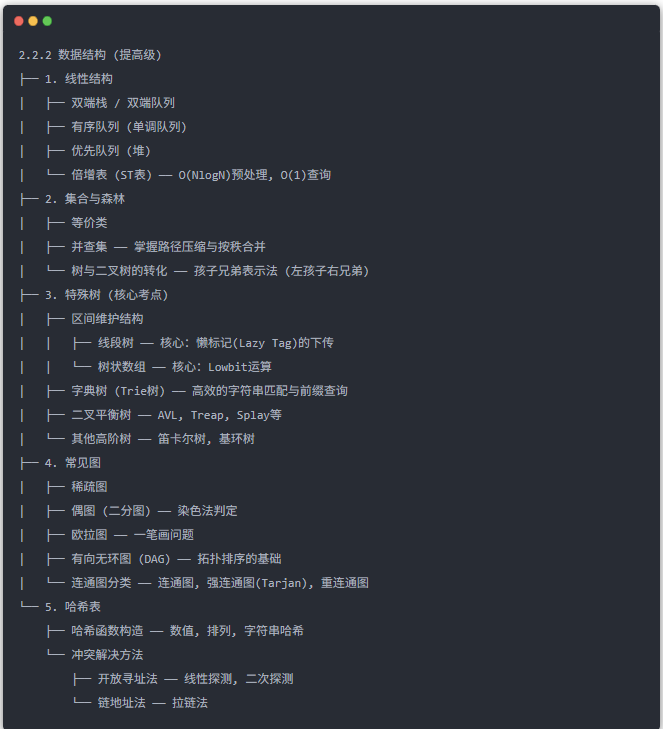 - 线性结构包含双端栈、双端队列、有序队列(单调队列)、优先队列,以及用于解决RMQ(区间最值查询)问题的倍增表(ST表)。