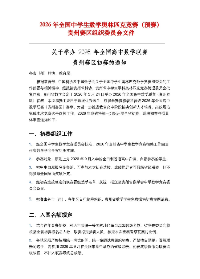 2026年高中数学联赛贵州赛区初赛通知