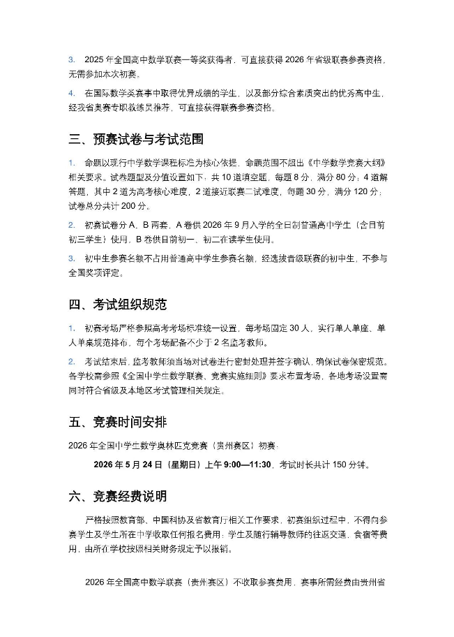 2026年高中数学联赛贵州赛区初赛通知发布,考试时间:5月24日上午9:00-11:30,本文特整理相关安排,详情如下: