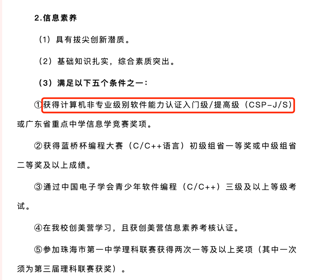 部分学校的简章中,除了在报名条件中提到初中毕业生需提供的奖项证明,如珠海市第一中学的条件之一有“获得计算机非专业级别软件能力认证入门级/提高级(CSP-J/S)或广东省重点中学信息学竞赛奖项”。