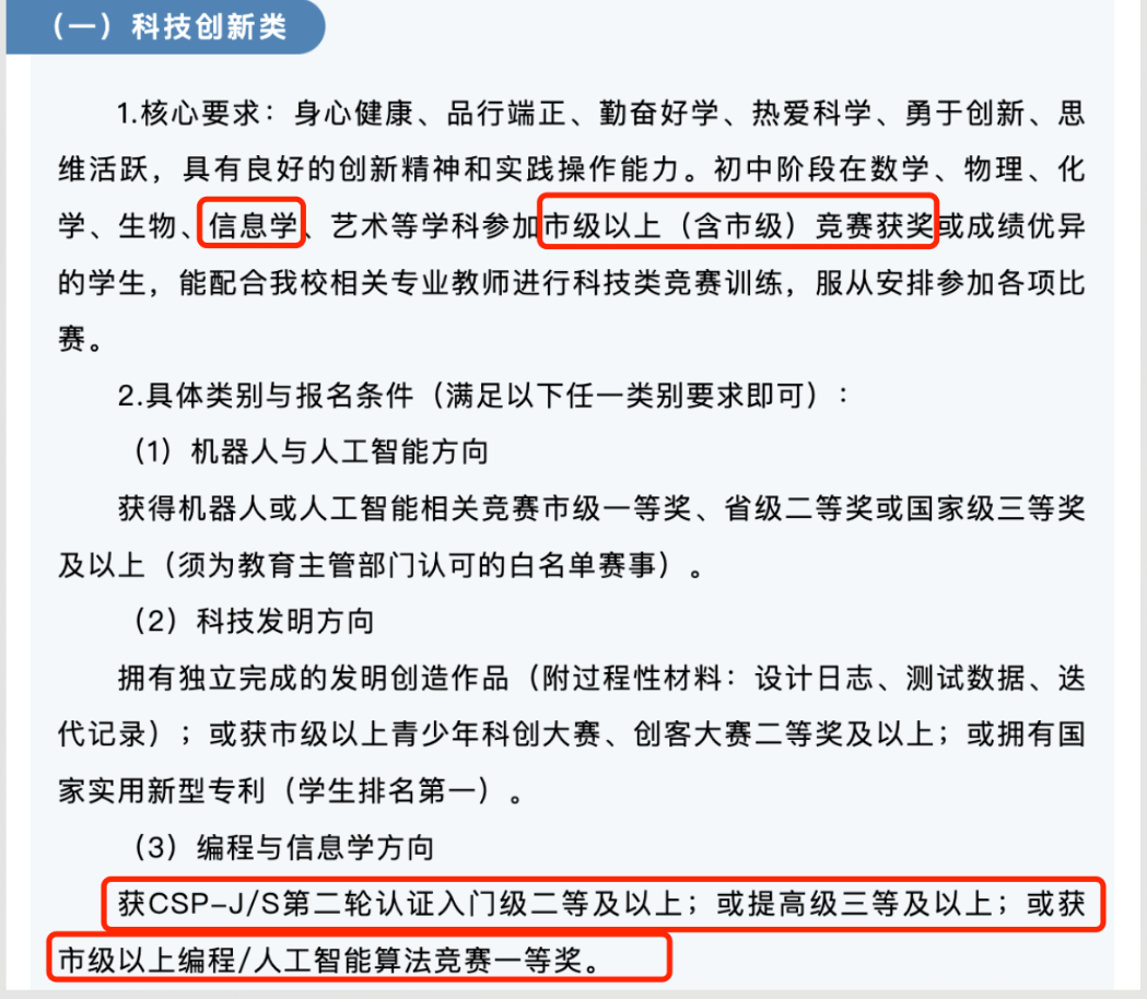 珠海市实验中学的核心要求中包括“初中阶段在信息学等学科参加市级以上(含市级)竞赛获奖或成绩优异的学生,能配合竞赛训练,服从安排参加各项比赛”的条件;报考条件中在编程与信息学方向要求“获 CSP-J/S 第二轮认证入门级二等及以上;或提高级三等及以上;或获市级以上编程/人工智能算法竞赛一等奖”。