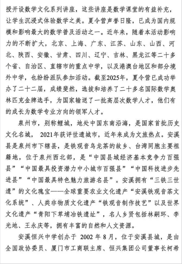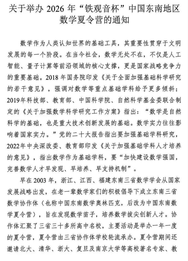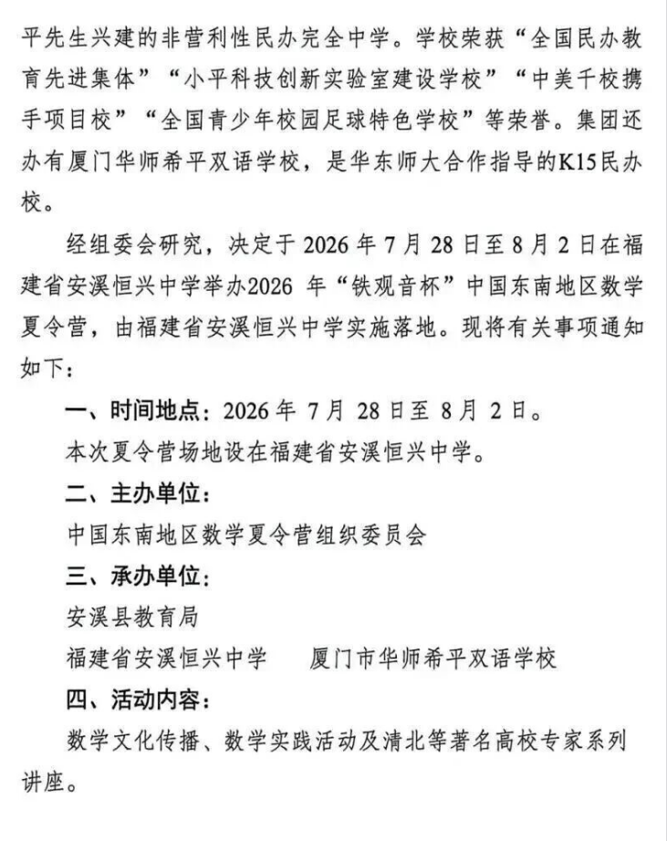 近日,官方发布了2026年“铁观音杯”中国东南地区数学夏令营活动通知。本次夏令营将于2026年7月28日至8月2日在福建省安溪恒兴中学举行,有意组队参加此项活动的学校可在7月1日前进行报名。以下为通知原文: