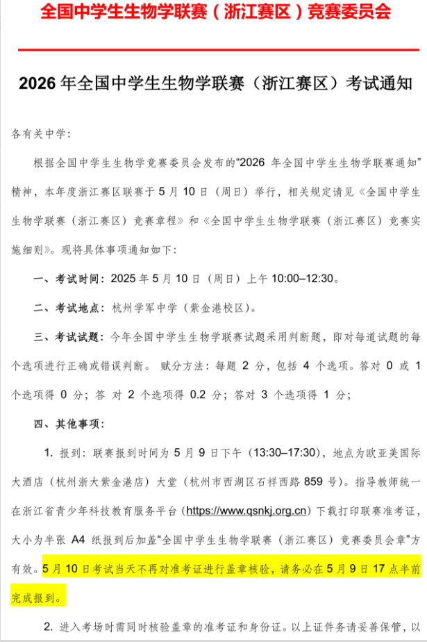 2026年浙江生物联赛通知来了! 考试时间定于5月10日上午10:00-12:30。自主选拔在线团队已为大家整理好完整的通知详情,建议考生和家长收藏查看,切勿错过关键信息。