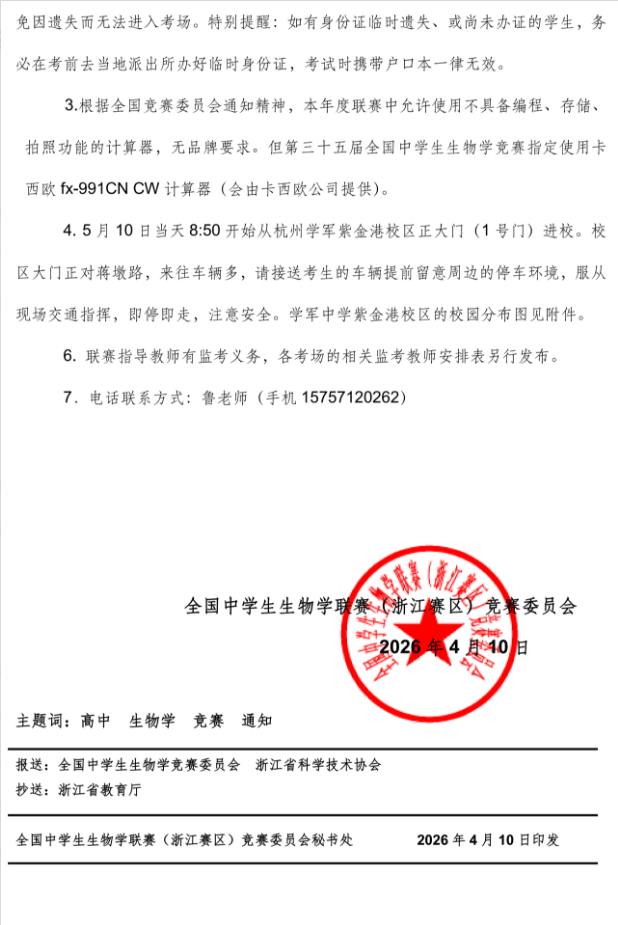 2026年中学生物学联赛(浙江赛区)考试通知发布,考试时间5月10日上午10:00-12:30,和自主选拔在线一起来看通知详情。