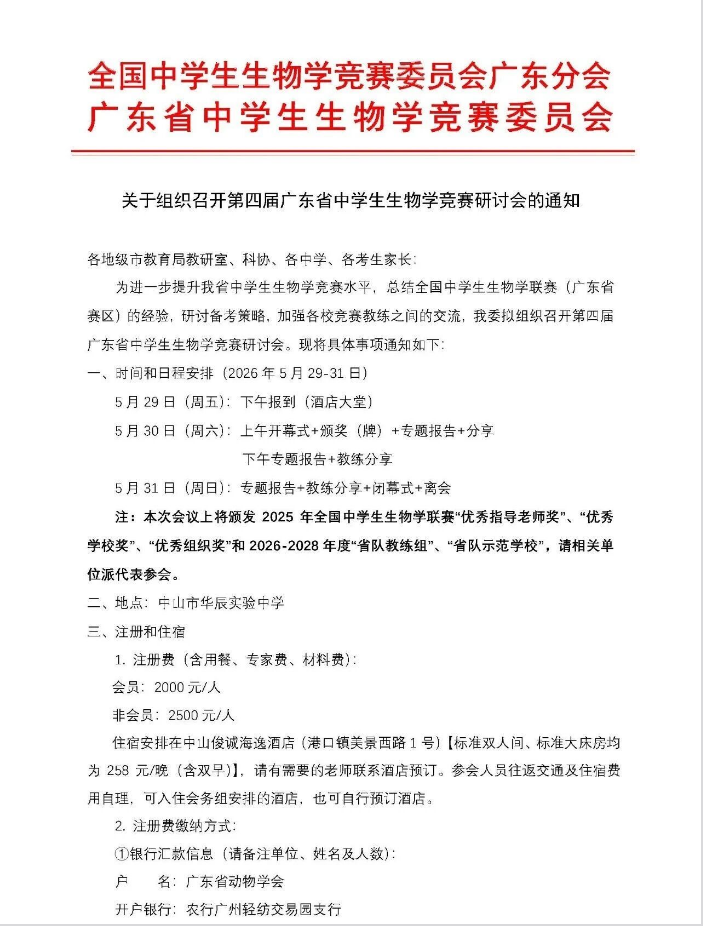 2026年第四届广东省中学生生物学竞赛研讨会通知发布,自主选拔在线第一时间更新通知内容,一起来看。