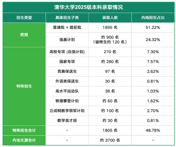 从清华大学录取结果上看,据统计清华大学通过高考统招、强基计划、自强计划等十余种招生类型,共录取内地学生 3700 余人,其中强基计划招生人数占比达到了 24.32%,相当于每 4 人中就有 1 人是参与强基计划被录取的。