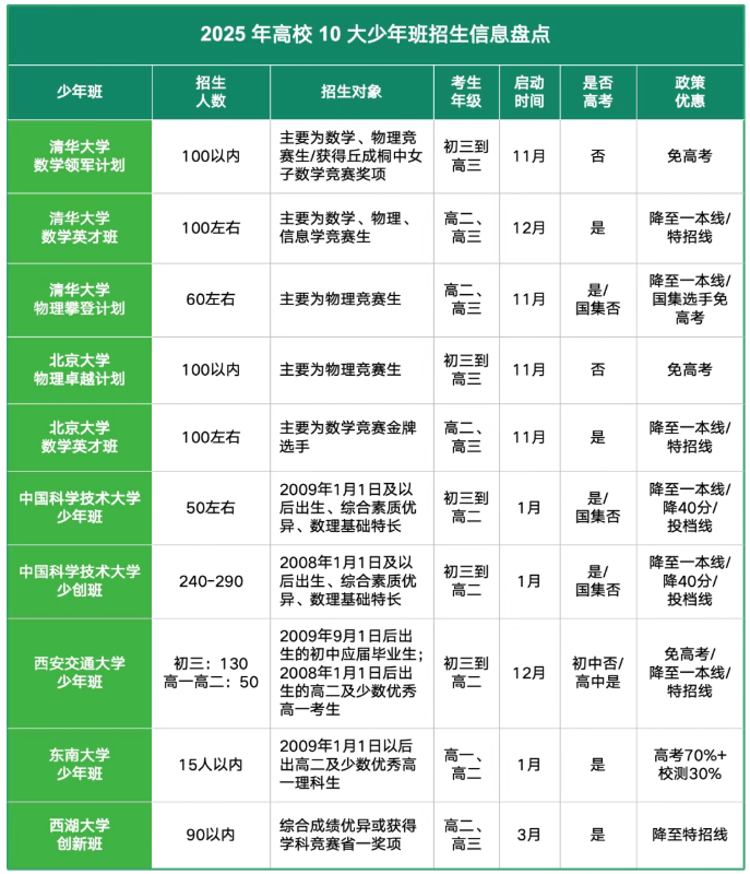 目前,国内共有 6 所高校的 9 类少年班进行招生,面向初三至高三学生(不同班型招生范围不一),实行免高考、直降一本线录取等招生优惠政策。