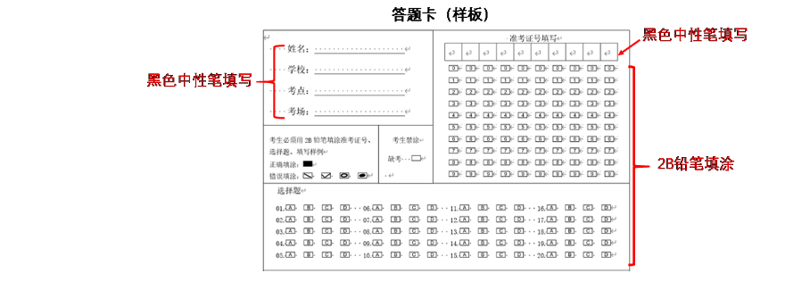 3. 本次考试全部采用选择题,阅卷方式采用机器自动批阅,答题卡中考生必须用2B铅笔填涂准考证号、选择题,用黑色中性笔填写姓名、学校、考点、考场和准考证号。要求考生必须准备好2B铅笔和黑色中性笔。